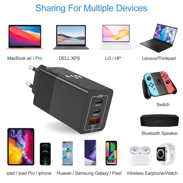 PD GaN Fast Charger 3port QC4.0 65W Type C Charger Adapter 45W 20W Images |